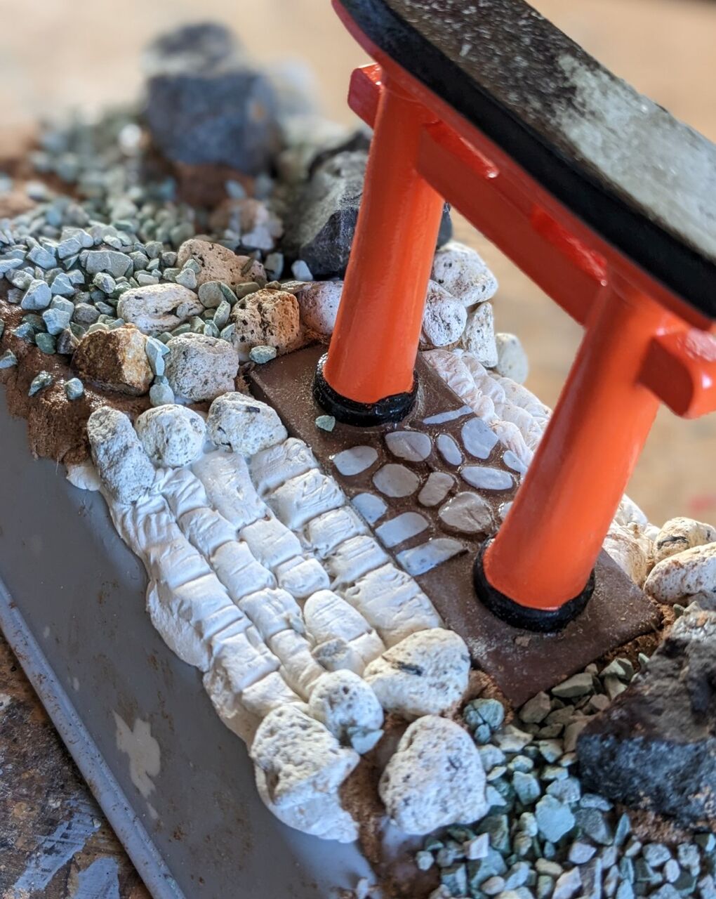 粘土が乾く前に、木工用ボンドをたっぷり塗ったバークチップを埋め込むように接着。乾いたら、アクリル絵の具で塗装。地面は木塑粘土の色、各種砂利も元の色を生かしつつ陰影をつける感じ。階段には黒と灰色でしっかり塗装。