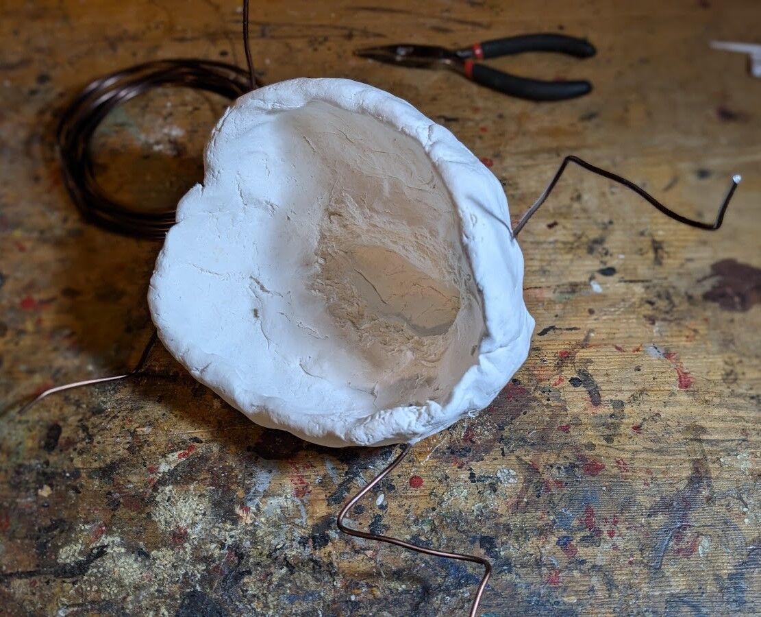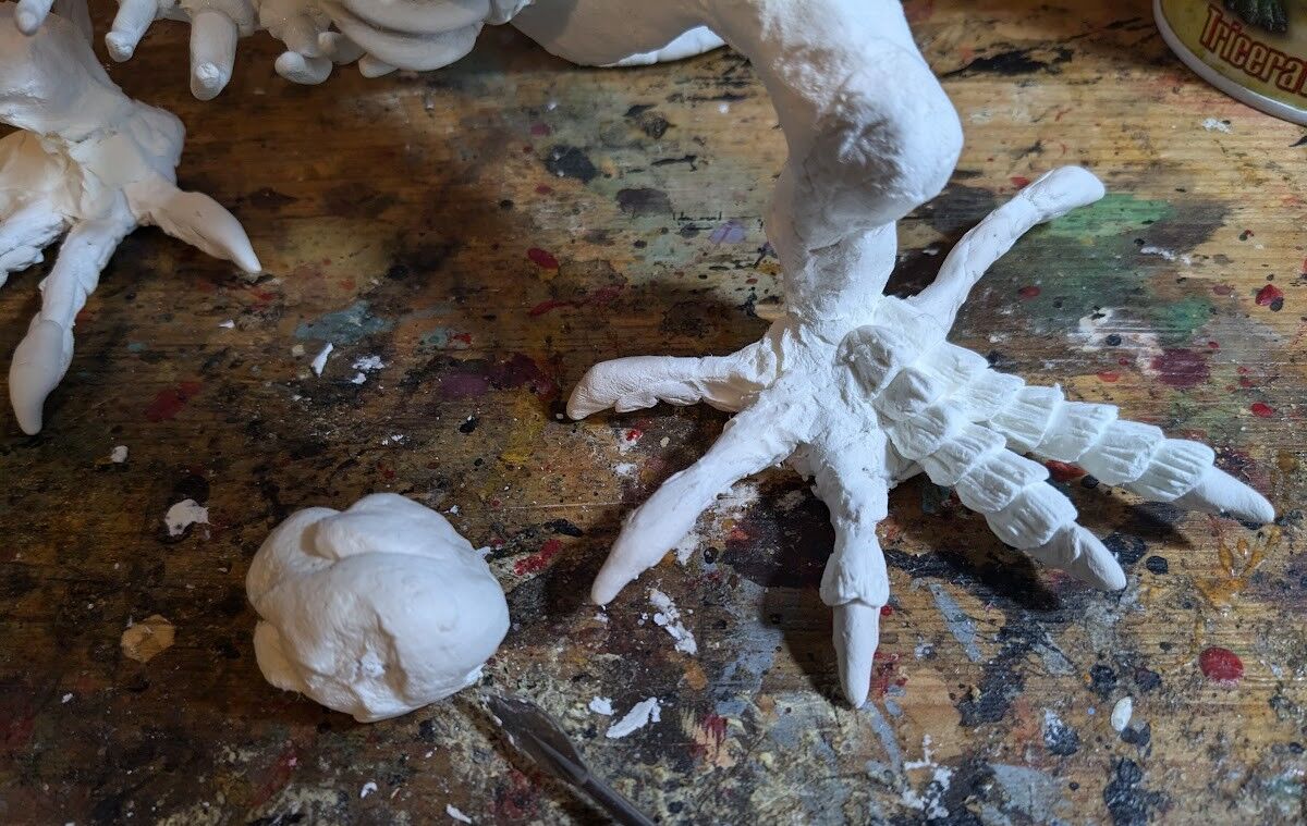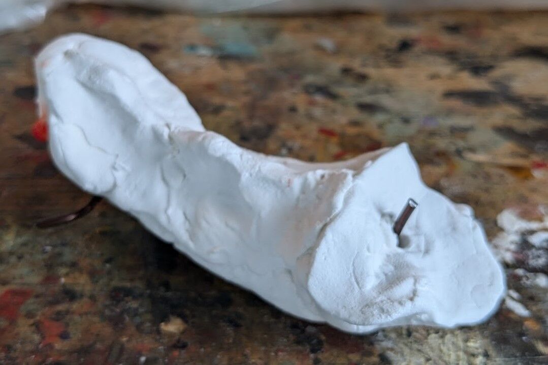 粘土を盛って、手足の指に針金を延長する。