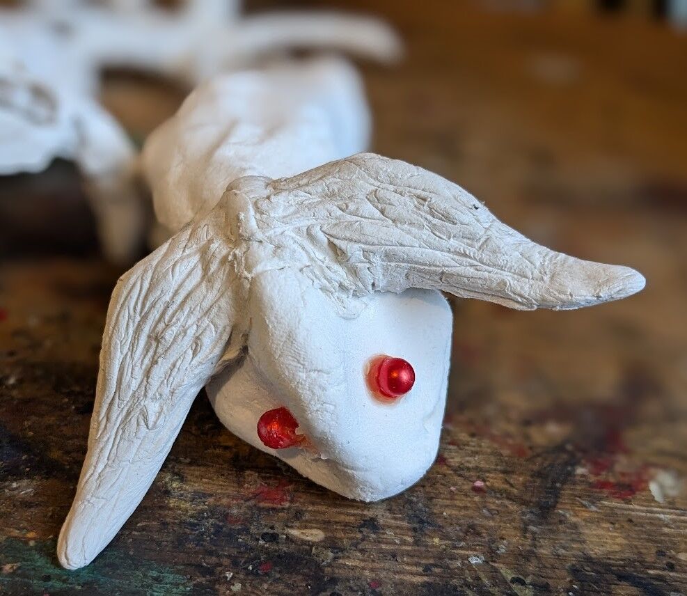 おっと顔を忘れてはいけません。原典に準じて赤目。カラービーズを接着。